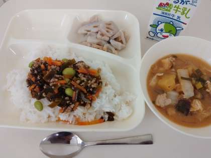 給食では炊き込みご飯が作れないので、もずくと豚ひき肉、にんじん、むき枝豆、切りこんぶを炊き合わせた具を各自でごはんに混ぜて食べるようにしています。