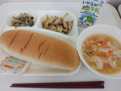 今日の献立は「コッペパン、アプリコットジャム、豚肉のカレー風味焼き、白菜のスープ、もやしとピーマンのいためもの、牛乳」でした。