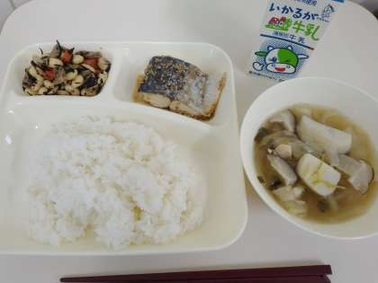 今日の献立は「ごはん、さごしのごまじょうゆかけ、五目汁、大豆の煮もの、牛乳」でした。