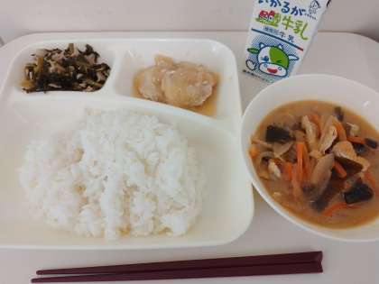 今日の献立は「ごはん、鶏肉のおろしじょうゆかけ、みそ汁、小松菜のいためもの、牛乳」でした。