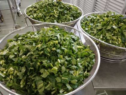 給食では旬となる11月から2月まで生のものを使っています。(他の季節は冷凍のものを使用)今日の給食では福岡県産のものを67kg使いました。いためものにすると少しになってしまいましたが、生の時は直径65cmの大きなざるに山盛り3杯もあったのですよ。(写真下)