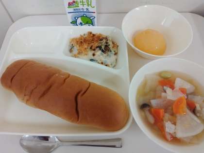 今日の献立は「黒糖パン、ほうれん草のグラタン、スープ煮、白桃(缶)、牛乳」でした。