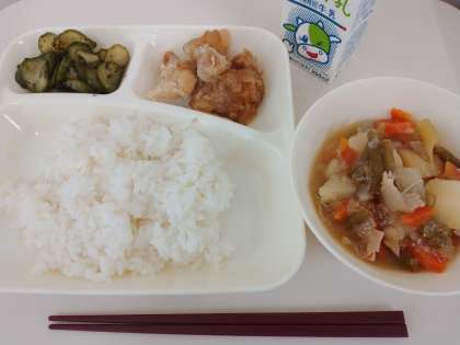今日の献立は「ごはん、あげどりのねぎだれかけ、豚肉とじゃがいもの煮もの、きゅうりの赤じそあえ、牛乳」でした。