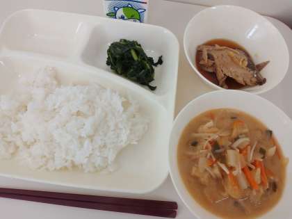 今日の献立は「ごはん、なまりぶしのしょうが煮、じゃがいものみそ汁、ほうれん草のおひたし、牛乳」でした。