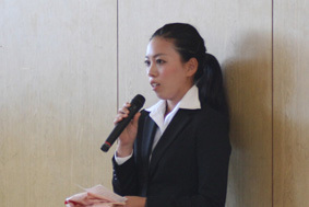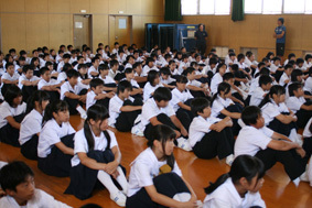 本日の5時間目に格技室で行われた一年生の学年会では、今週から英語科の教育実習生として来られている尾崎美千子先生の自己紹介と、留学時代の経験をお話いただいきました。