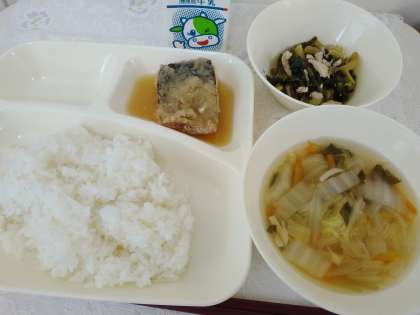 今日の献立は「ごはん、さばのみぞれかけ、すまし汁、小松菜の煮びたし、牛乳」でした。