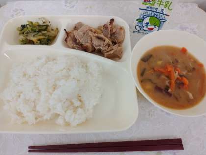 今日の献立は「ごはん、豚肉のしょうが焼き、さつまいものみそ汁、きくなと白菜のごまあえ、牛乳」でした。