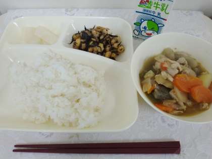 今日の献立は「ごはん、鶏肉と野菜の煮もの、ひじき豆、かぶのゆず風味、牛乳」でした。