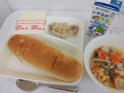 今日の献立は「おさつパン、あじのレモンマリネ、てぼ豆のスープ煮、スライスチーズ、牛乳」でした。
