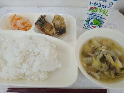 今日の献立は「ごはん、さばのカレーたつたあげ、五目汁、紅白なます、牛乳」でした。