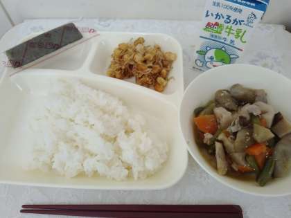 今日の献立は「ごはん、筑前煮、じゃこ豆、焼きのり、牛乳」でした。