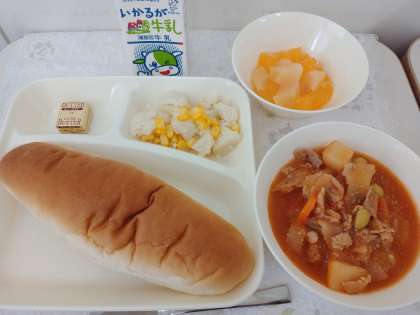 今日の献立は「コッペパン、バター、豚肉と野菜のケチャップ煮、カリフラワーのピクルス、フルーツゼリー、牛乳」でした。