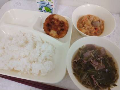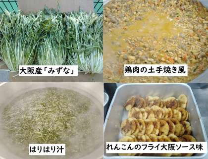 今日の献立は「ごはん、鶏肉の土手焼き風、はりはり汁、れんこんのフライ大阪ソース味、牛乳」でした。この献立は、昨年度の学校給食献立コンクールの受賞作品です。ねらいは「大阪の郷土食をみんなで持ち寄り、一つの献立にまとめ、給食で実施できるようアレンジした」ということです。