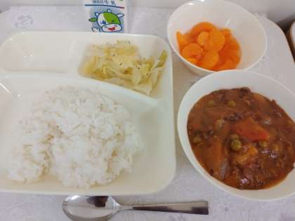今日の献立は「ハヤシライス、キャベツのバジル風味サラダ、みかん(缶)、牛乳」でした。