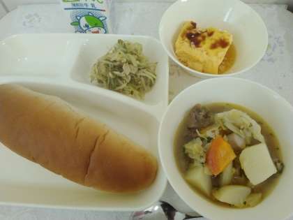 今日の献立は「黒糖パン、ポトフ、カレーソテー、焼きプリン、牛乳」でした。