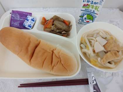 今日の献立は「コッペパン、ブルーベリージャム、豚肉とごぼうの煮もの、なにわうどん、固形チーズ、牛乳」でした。