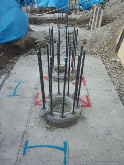 本日は、杭頭補強筋の取付と、基礎用の足場組立を行いました。