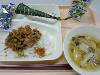 今日の献立は「きんぴらちらし、すまし汁、ちまき、牛乳」でした。ひと足早く「こどもの日の行事献立」です。こどもたちの健やかな成長を願い、毎年、実施しています。給食では冷凍で納品されたちまきを給食室で蒸しあげました。