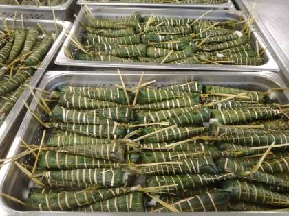 給食のちまきの材料はすべて国産で、もちは愛知県の工場で製造され、笹巻きは新潟県の工場で地元の熟練の職人さんが1本ずつ手作業で行ってくださっています。市販されているものに比べ、甘さを控えた大阪市独自のものです。