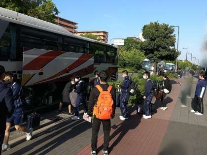荷物を積み込み、7時10分バス1号車の発車です。早朝からお見送りいただき、ありがとうございました。