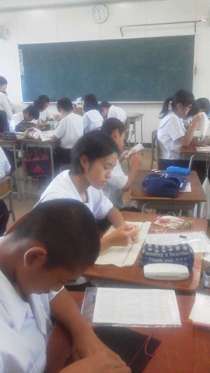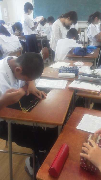 男女とも慣れない針と糸で、思い思いの絵柄を、