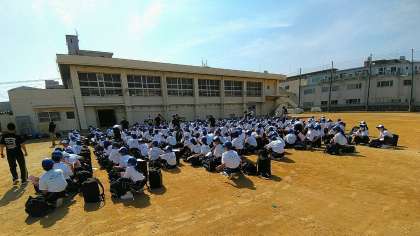 晴天のもと、いよいよ始まります。生徒代表のあいさつのあとは、出発前に忘れ物がないか最終確認です。