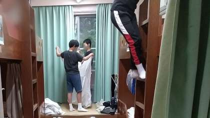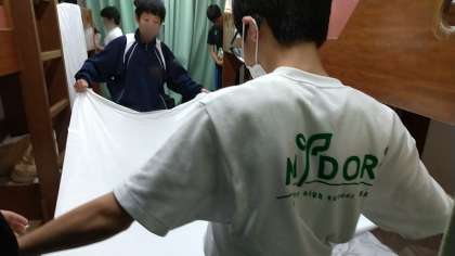 おはようございます。6時30分起床。昨夜はぐっすりとよく眠られたようです。外は、あいにくの雨ですが、部屋では協力してシーツをたたむなど、退所準備を始めています。