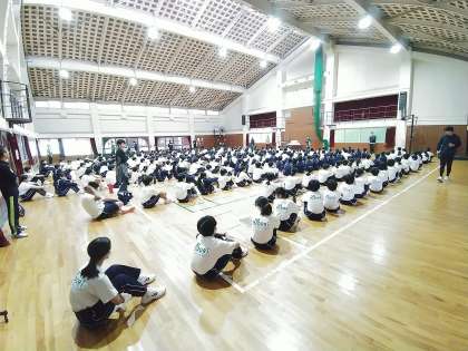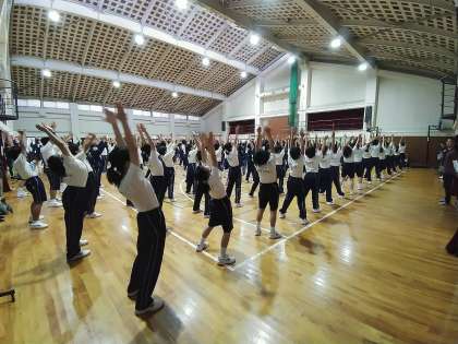 朝の集い。隊形整列練習とラジオ体操を体育大会の練習を兼ねて行いました。身体が温まり、聴く力や集中力が高まります。