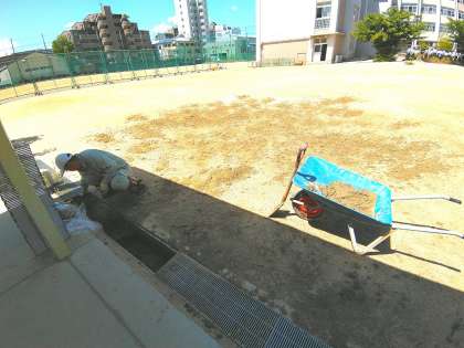 早くも台風2号が発生し、台湾方面に進んでいるとのことで、沖縄や奄美地方は、梅雨入りしています。近畿も例年6月中旬までには、梅雨入りしていますので、それまでにと、運動場の雨水の排水を促せるよう、運動場周りの側溝を埋めている土砂を掻き出し始めています。
