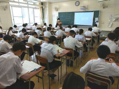 きょうとあすは、中間テストです。1年生にとって初めての定期テスト。1時間目は国語でした。国語担当の先生が質問がないかと、まわってきました。テスト勉強した内容が出題されているといいですね。
