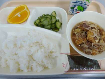今日の献立は「ご飯、すき焼き煮、きゅうりのしょうがづけ、焼きのり、オレンジ、牛乳」でした。