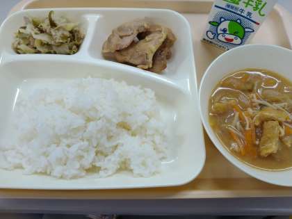 今日の献立は「ご飯、鶏肉のしょうゆバター焼き、みそ汁、野菜いため、牛乳」でした。