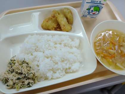 今日の献立は「ご飯、白身魚フリッター、すまし汁、とり菜っ葉いため、牛乳」でした。