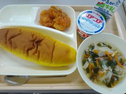 今日の献立は「パンプキンパン、えびのチリソース、中華スープ、ヨーグルト、牛乳」でした。