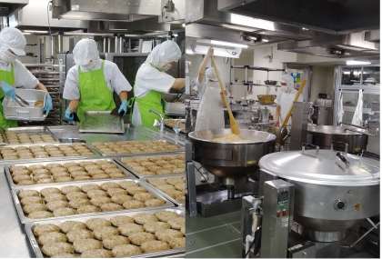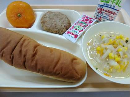 8月はまだまだ暑い時期なので、皆さんが食べやすい献立をそろえています。今日の献立は「黒糖パン、焼きハンバーグ、豆乳スープ、冷凍みかん、牛乳」でした。