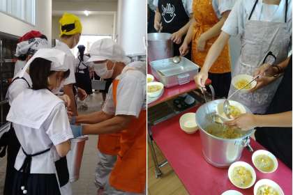給食当番の人は服装を整え役割を確認し、安全に活動しましょう。給食当番以外の人は早く準備ができるよう、自分の行動を考えましょう。暑さに負けないためにはしっかりと食べることが大切です。食べる時間が十分に確保できるよう、みんなで協力して安全安心で楽しい給食の時間にしましょう。