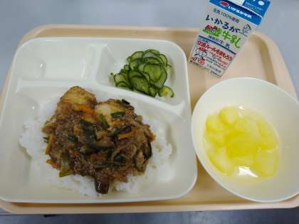 今日の献立は「マーボーあつあげ丼、あっさりきゅうり、りんご(カット缶)、牛乳」でした。