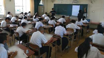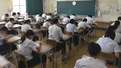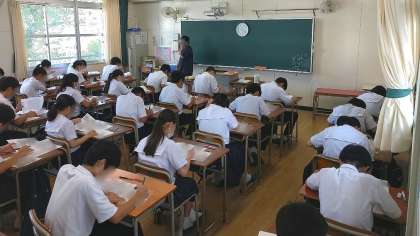 3年生は中学生チャレンジテスト、1、2年生は課題テストを実施しています。写真は、1時間目の国語のテストに取り組んでいる様子です。
