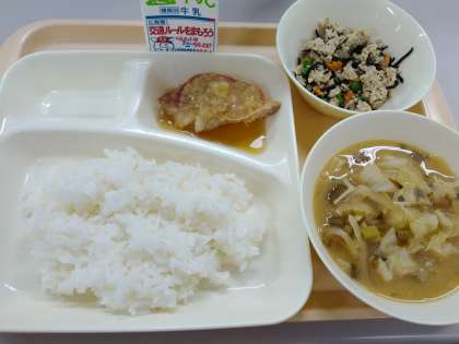 今日の献立は「ご飯、赤魚のおろしじょうゆかけ、みそ汁、高野どうふのいり煮、牛乳」でした。