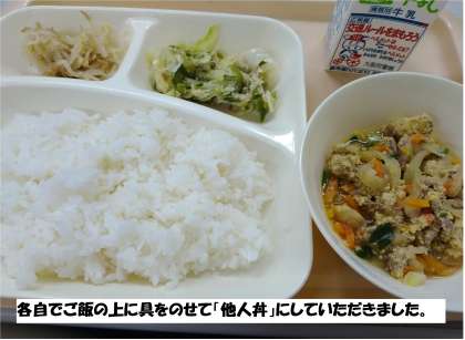 今日の献立は「他人丼、ささみと野菜のいためもの、もやしの甘酢あえ、牛乳」でした。
