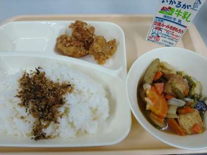 今日の献立は「ご飯、鶏肉のたつたあげ、あつあげと野菜の煮もの、おかか菜っ葉、牛乳」でした。
