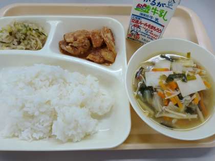 今日の献立は「ご飯、鶏肉のチリソース焼き、焼き豚とワンタンの皮のスープ、切り干し大根のごま辛みづけ、牛乳」でした。