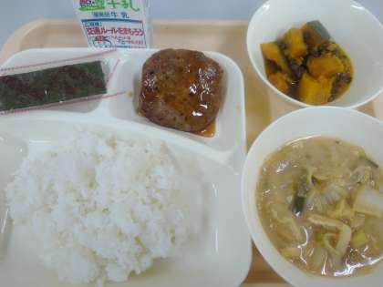 今日の献立は「ご飯、和風ハンバーグ、みそ汁、かぼちゃのいとこ煮、焼きのり、牛乳」でした。