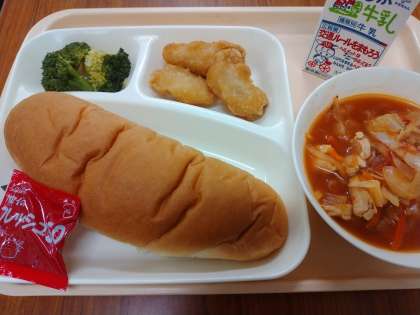 今日の献立は「コッペパン、いちごジャム、白身魚フリッター、ミネストローネ、ブロッコリーのサラダ、牛乳」でした。今日は今シーズン初めてのブロッコリーの登場です。