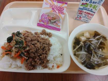 (今日の献立…ビビンバ、わかめスープ、いもけんぴフィッシュ、牛乳)