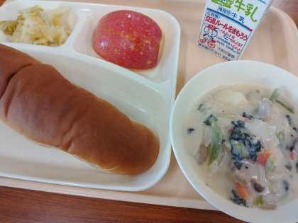 今日の献立は「黒糖パン、きのこのクリームシチュー、キャベツのピクルス、りんご、牛乳」でした。