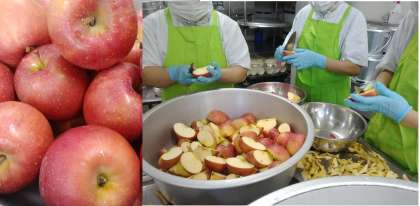 今日の給食のりんごも青森県産で「早生(わせ)ふじ」という種類です。甘みが強く、蜜がたっぷり入る「ふじ」より、1か月ほど早く成熟するので「早生」という名前が付いています。