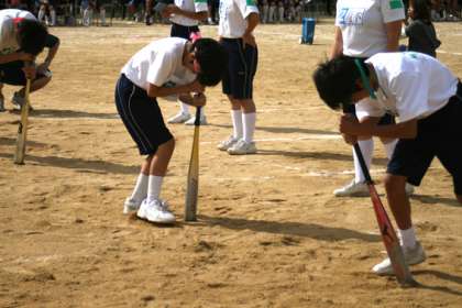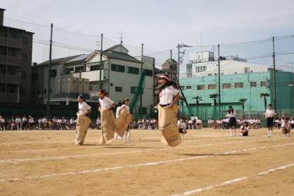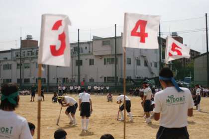 日差しが強くなるにつれ、歓声も一層おおきくなっています。50mJB走(ジャンプ・バット)では、麻袋で飛び跳ねたのちにバットを頭に付け10回転します。ラストの直線は足元がフラフラと、思うように走れず一発逆転のレースがたくさん見られました。