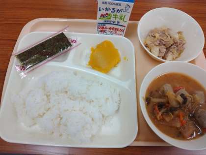 今日の献立は「ご飯、豚肉と野菜のいためもの、いわしのつみれ汁、焼きのり、かぼちゃういろう、牛乳」でした。