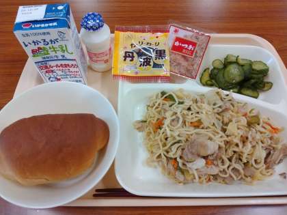 (今日の献立…黒糖パン、和風焼きそば、きゅうりのしょうがづけ、いり黒豆、発酵乳、牛乳)